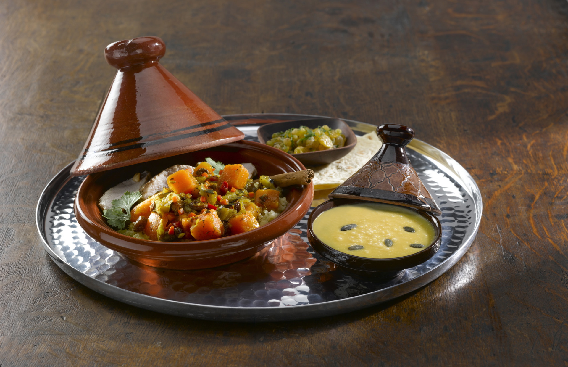 الخرشوف الصغير والبازلاء الربيعية والبزورات المختلفة مثل اللّوز أو الفستق من المكونات الشائعة في أطباق الطاجن. غالباً ما تُرافق هذه الأطباق الكسكس أو الأرز المطبوخ على البخار أو الخبز الساخن الطازج. والأصناف لا حصر لها؛ من طاجن المأكولات البحرية مع بلح البحر وإدام الطماطم، إلى طاجن لحم الضأن مع الخضروات مثل البصل والجزر والبطاطا والزيتون، والفواكه مثل المشمش والزبيب، والكثير من التوابل مثل الفليفلة الحمراء والسوداء والكمّون والزعفران والكركم، الطاجن طبق وطني مُمتلِئ بالإبداع والنكهة.