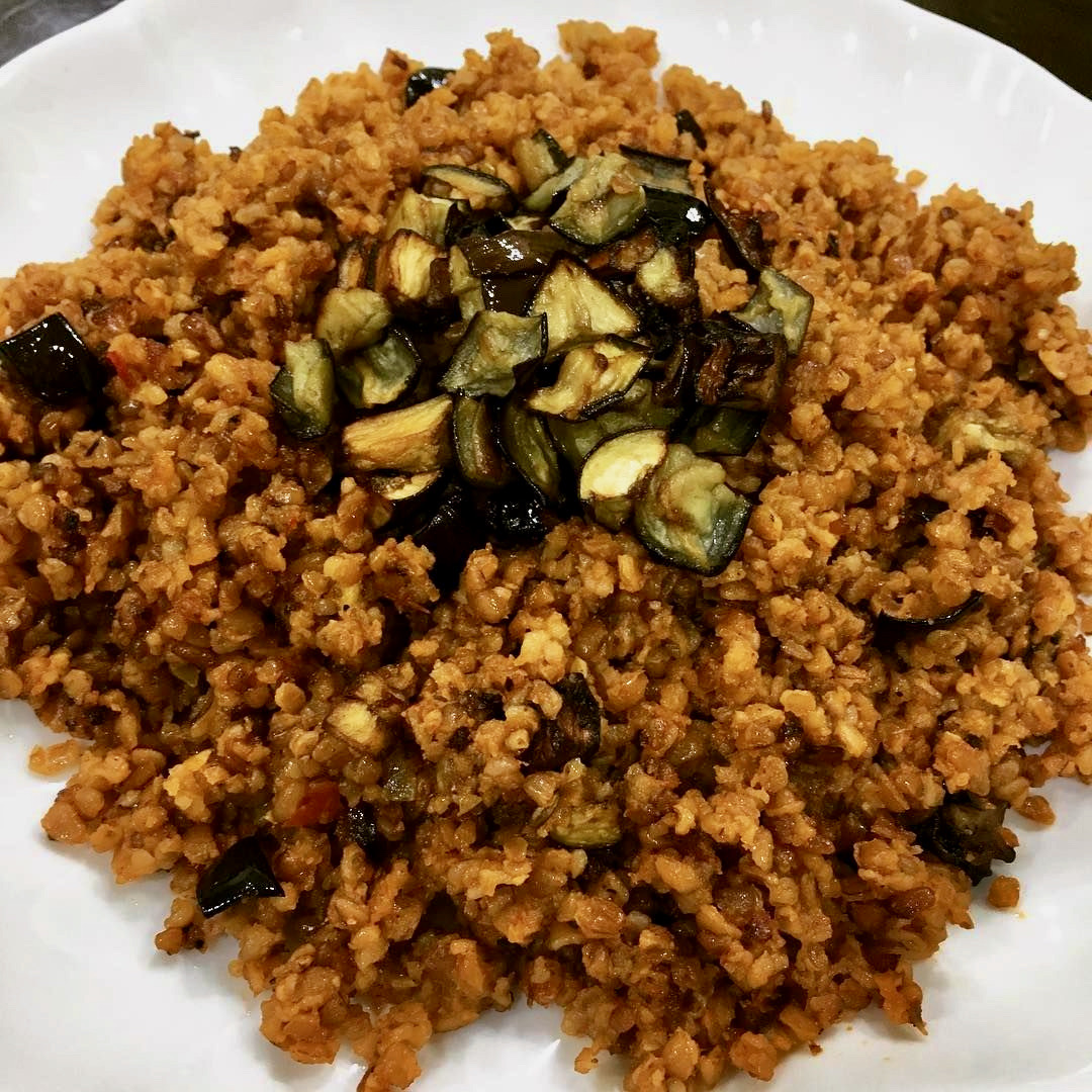 يُطبخ الثوم والبصل بزيت الزيتون حتى يلين، ثم تُضاف مكعبات الباذنجان والطماطم والبرغل والفليفلة الخضراء والتوابل مثل القرفة والفلفل الأسود والكمّون. يُغطّى المزيج بالماء الساخن ويُطبخ حتى ينضج.
