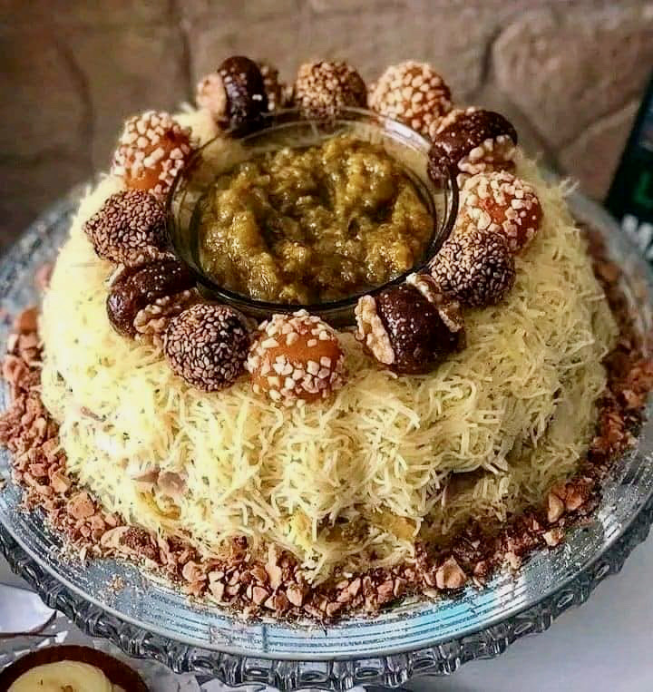 بعد طبخ الشعيريّة أو الكسكس، تُمزج مع الإدام برفق. يُنقل المزيج إلى طبق التقديم ويُشكّل على هيئة هرم. يُرش السكّر الناعم والقرفة فوق السطح، ثم تُضاف البزورات المطحونة والزبيب بنمط جميل.